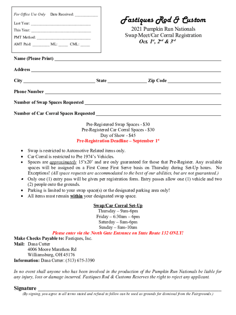 For Office Use Validate Received: Last Year: This Year: PMT Method: AMT Paid: ML: CML: Antiques Rod & Custom 2021 Pumpkin Run Nationals Swap Meet/Car Corral Registration Oct. 1st, 2nd & 3rdName (Please