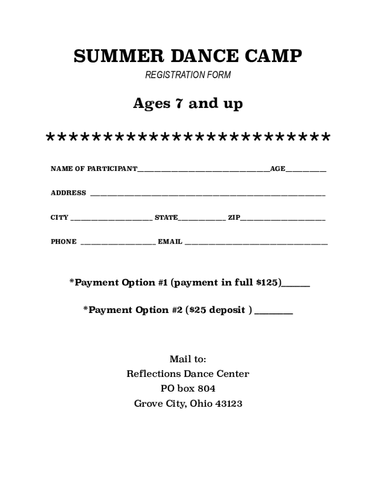 SUMMER DANCE CAMP REGISTRATION Forages 7 and up************************* NAME OF PARTICIPANT AGE ADDRESS CITY STATE ZIP PHONE EMAIL *Payment Option #1 (payment in full $125) *Payment Option #2 ($25