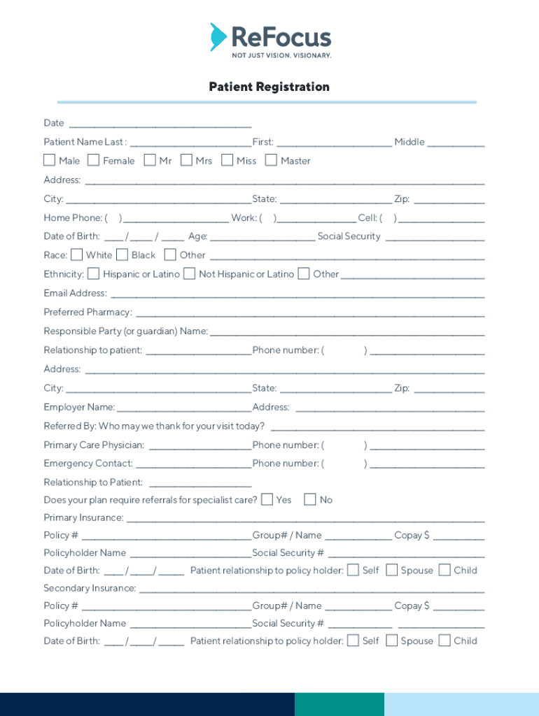 Patient Registration Date Patient Name Last : First: Middle MaleFemaleMrMrsMissMasterAddress: City: State: Zip: Home Phone: () Work: () Cell: () Date of Birth: / / Age: Social Security Race: Ethnicity:WhiteBlackOther