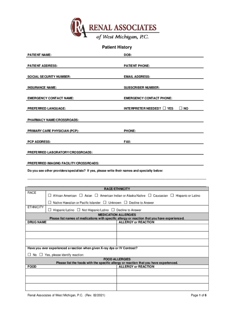 Patient History PATIENT NAME:DOB:PATIENT ADDRESS:PATIENT PHONE:SOCIAL SECURITY NUMBER:EMAIL ADDRESS:INSURANCE NAME:SUBSCRIBER NUMBER:EMERGENCY CONTACT NAME:EMERGENCY CONTACT PHONE:PREFERRED LANGUAGE:INTERPRETER