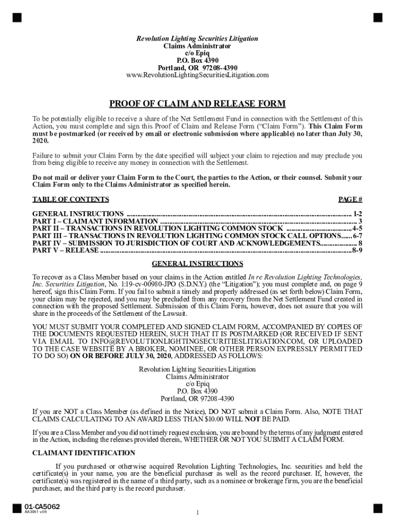 Revolution Lighting Securities Litigation Claims Administrator c/o Epic P.O. Box 4390 Portland, OR 972084390 www.RevolutionLightingSecuritiesLitigation.comPROOF OF CLAIM AND RELEASE FORM To be potentially
