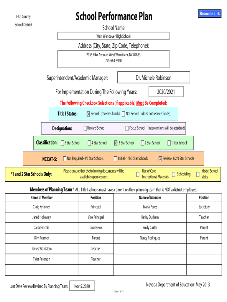 School Performance Plane County School DistrictResource LinkSchool Name West Wend over High SchoolAddress (City, State, Zip Code, Telephone): 2055 Elk Avenue, West Wend over, NV 89883 7756643940Dr.