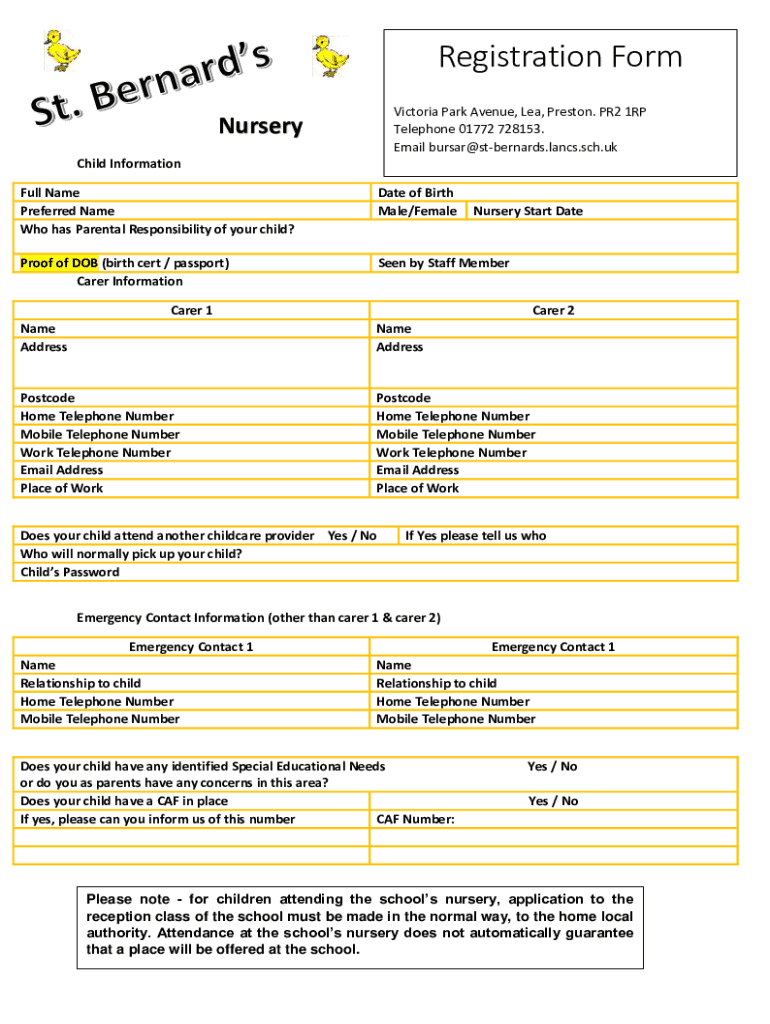 Registration Form Victoria Park Avenue, Lea, Preston. PR2 1RP Telephone 01772 728153. Email bursar@stbernards.lancs.sch.ukNursery Child Information Full Name Preferred Name Who has Parental Responsibility