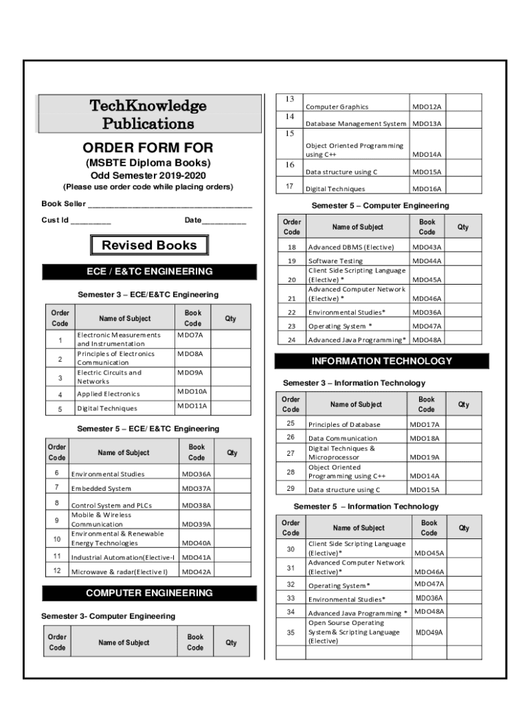 Acknowledge Publications13 14(SITE Diploma Books)16Odd Semester 20192020 (Please use order code while placing orders)17Book Seller Date Revised Books ECE / ETC ENGINEERINGName of Subjection Code MDO7A3Electronic