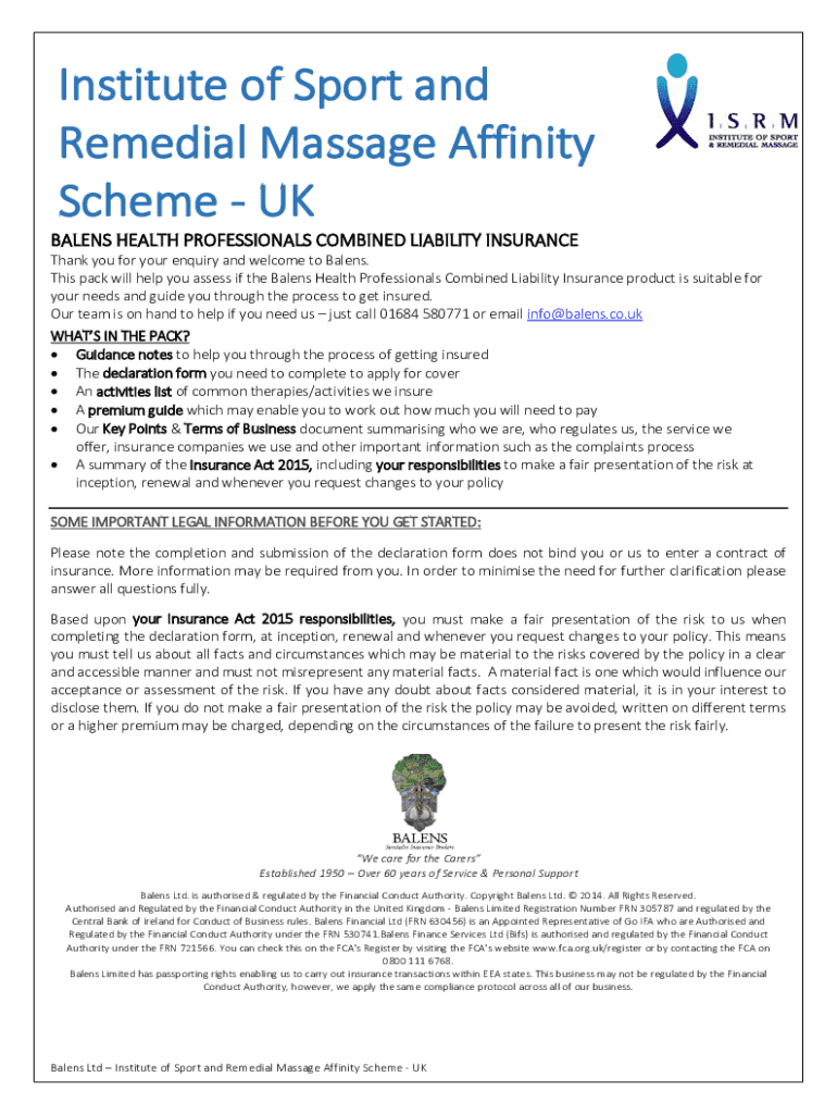 Institute of Sport and Remedial Massage Affinity Scheme BALES HEALTH PROFESSIONALS COMBINED LIABILITY INSURANCEThank you for your inquiry and welcome to Bales. This pack will help you assess if the