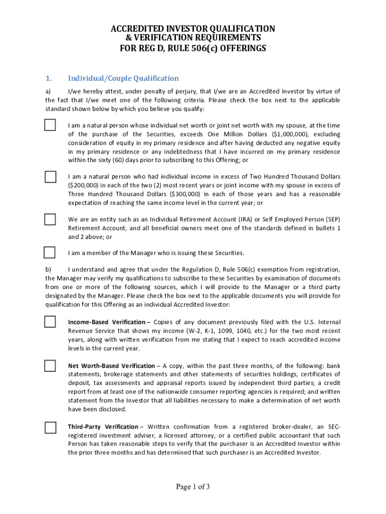 ACCREDITEDINVESTORQUALIFICATION &VERIFICATIONREQUIREMENTS FORMED,RULE506(c)OFFERINGS 1. Individual/CoupleQualificationa) I/weherebyattest, underpenaltyofperjury, that/weareanAccreditedInvestorbyvirtueof