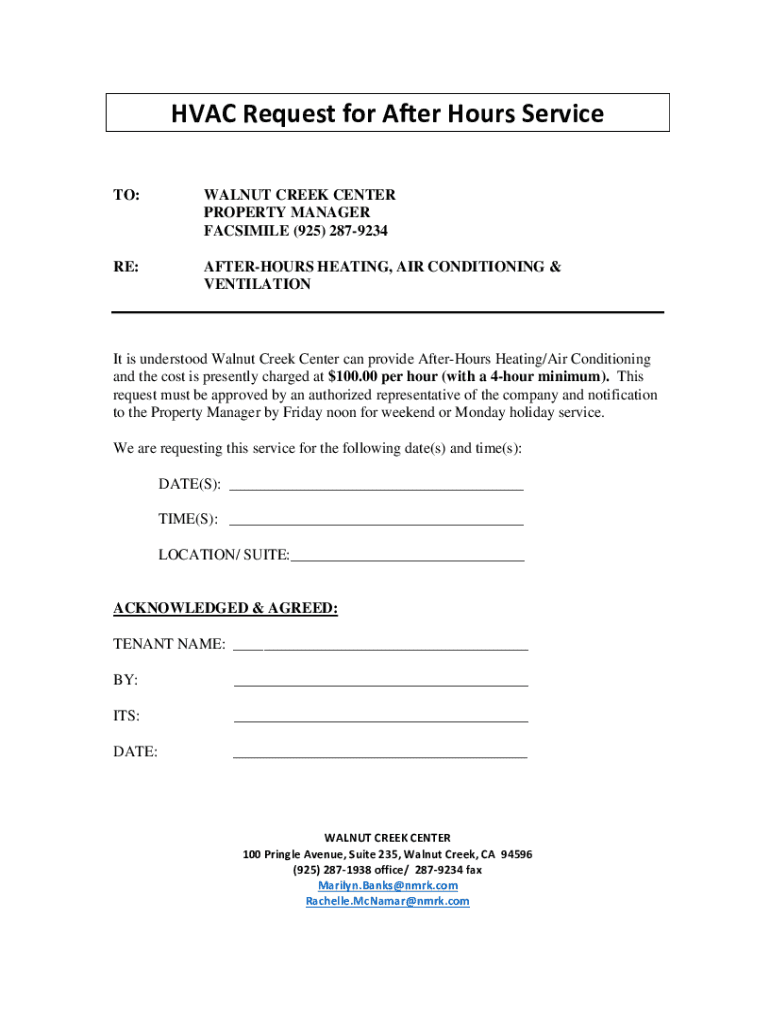 HVAC Request for After Hours Service TO:WALNUT CREEK CENTER PROPERTY MANAGER FACSIMILE (925) 2879234RE:AFTERNOONS HEATING, AIR CONDITIONING & VENTILATION It is understood Walnut Creek Center can provide