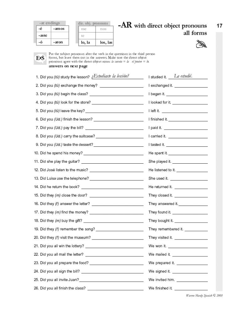Ar's endings Amos taste around. Obj. Pronouns me nos the lo, la Los, laser with direct object pronouns17all format the subject pronouns after the verb in the questions in the third-person forms, but