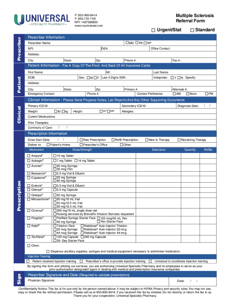 Multiple Sclerosis Referral FormPrescriberP: 8559008414 F: 8557107101 NPI: 1427588805 www.rxuniversal.comStandardUrgent/StatPrescriber Information Prescriber Name:PAN Office Contact:DEA:NPI: Address: