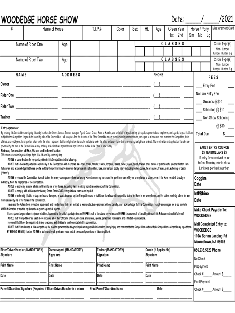 WOODED GE HORSE SHOW #Overcame of Horse Date: / /2021 T.I.P.#ColorSexHt. Age Green Year 1st 2ndName of Rider Onsager L A S ES Name of Rider Tragic L A S S E SNAMEADDRESS () Circle Type(s) Not. Jumper