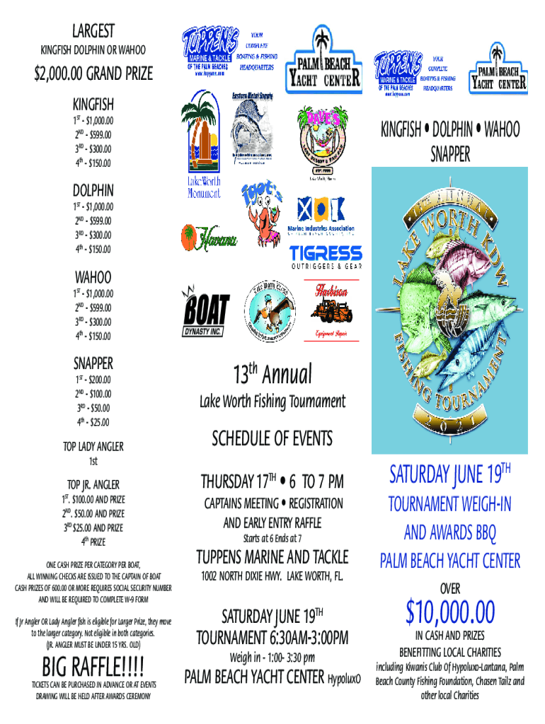 LARGESTKINGFISH DOLPHIN OR WAHOO$2,000.00 GRAND PRIZE KINGFISHER 1ST $1,000.00 2ND $599.00 3RD $300.00 4th $150.00KINGFISH DOLPHIN YAHOO SNAPPERDOLPHIN 1ST $1,000.00 2ND $599.00 3RD $300.00 4th $150.001ST