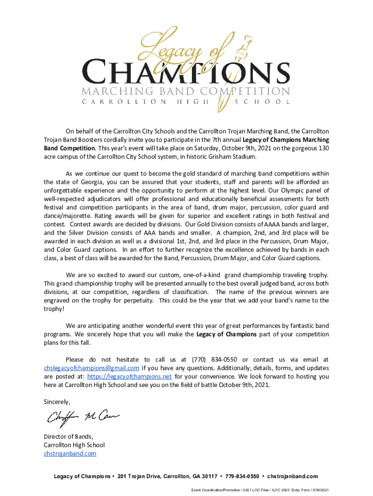 On behalf of the Carrollton City Schools and the Carrollton Trojan Marching Band, the Carrollton Trojan Band Boosters cordially invite you to participate in the 7th annual Legacy of Champions Marching
