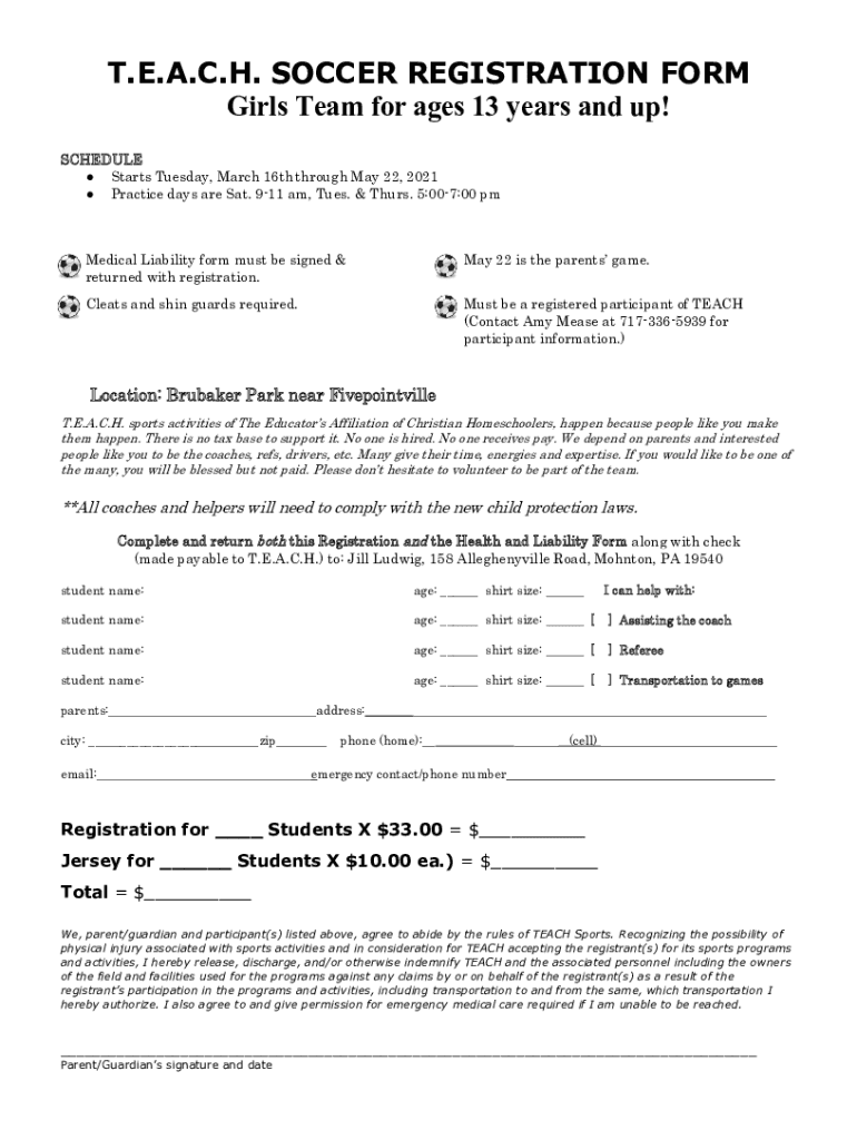 T.E.A.C.H. SOCCER REGISTRATION FORM Girls Team for ages 13 years and up! SCHEDULE Starts Tuesday, March 16th through May 22, 2021, Practice days are Sat. 911 am, Tues. & Thurs. 5:007:00 medical Liability