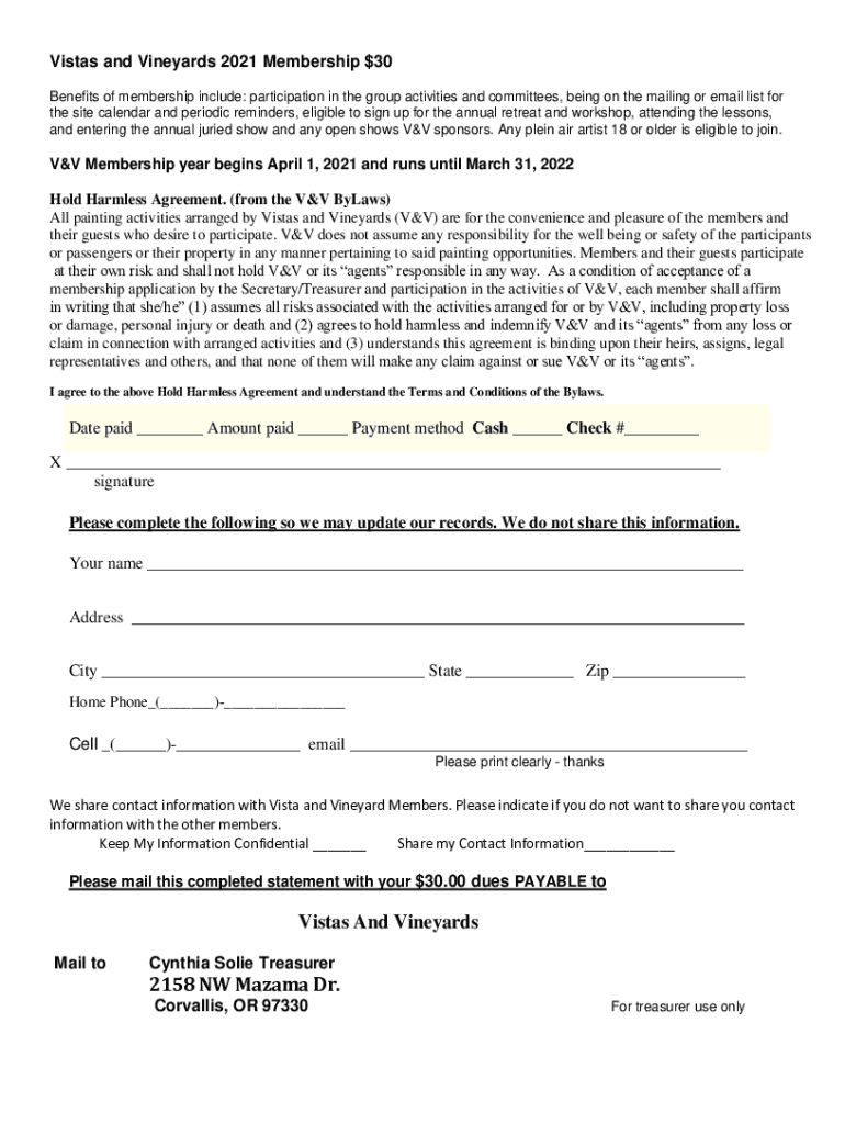 Vistas and Vineyards 2021 Membership $30 Benefits of membership include: participation in the group activities and committees, being on the mailing or email list for the site calendar and periodic