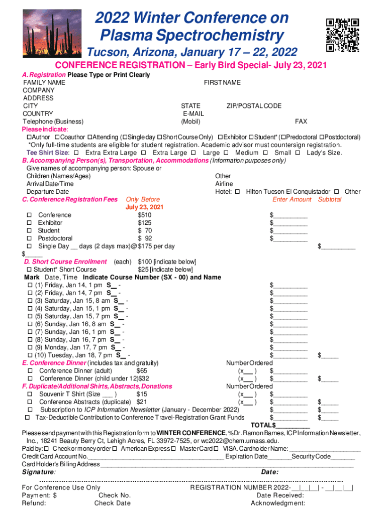 2022 Winter Conference on Plasma Electrochemistry Tucson, Arizona, January 17 22, 2022 CONFERENCE REGISTRATION Early Bird Special July 23, 2021, A. Registration Please Type or Print Clearly FAMILY