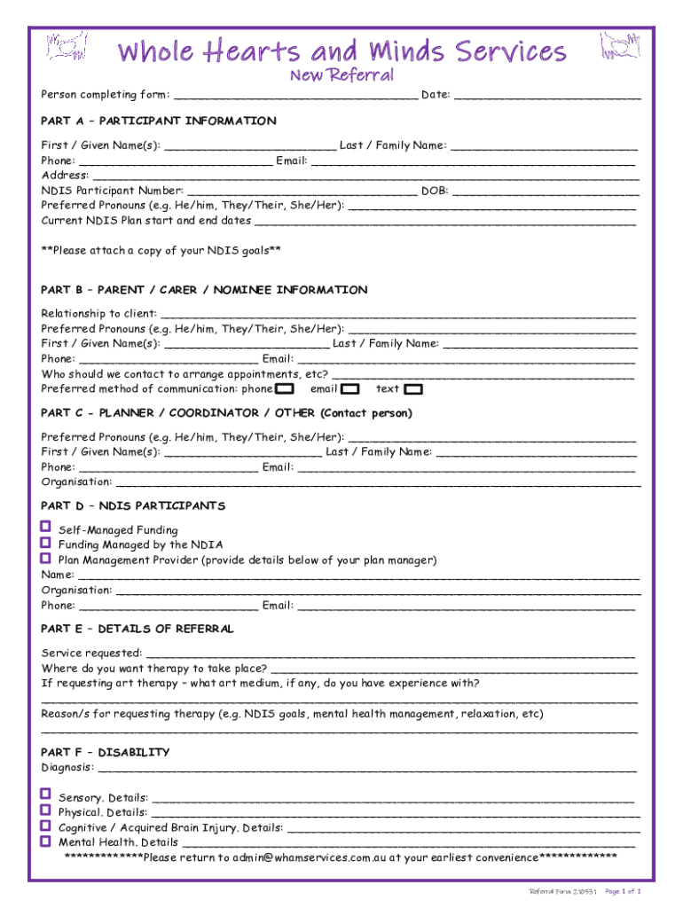 Whole Hearts and Minds Services New ReferralPerson completing form: Date: PART A PARTICIPANT INFORMATION First / Given Name(s): Last / Family Name: Phone: Email: Address: NDIS Participant Number: