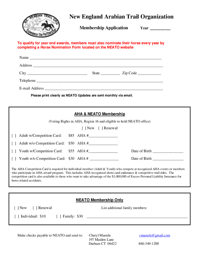 New England Arabian Trail Organization Membership ApplicationYear To qualify for year-end awards, members must also nominate their horse every year by completing a Horse Nomination Form located on