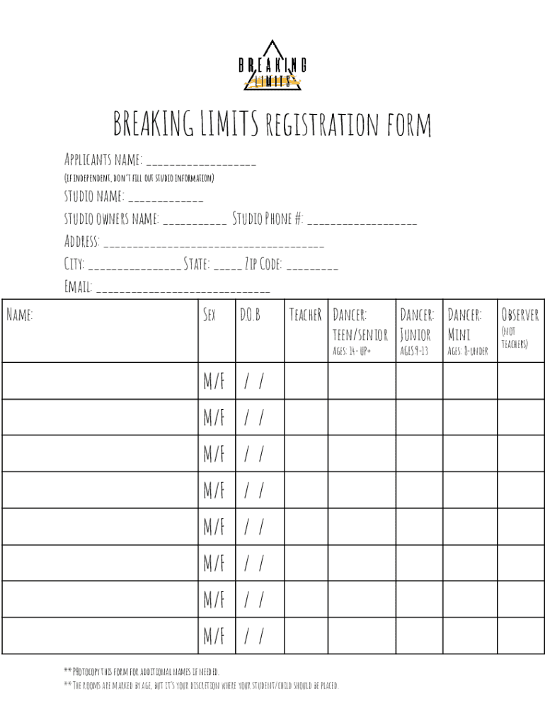 BREAKING LIMITS registration form Applicants name: (if independent, don't fill out studio information)studio name: studio owners name: Studio Phone #: Address: City: State: Zip Code: Email: Name:Send.