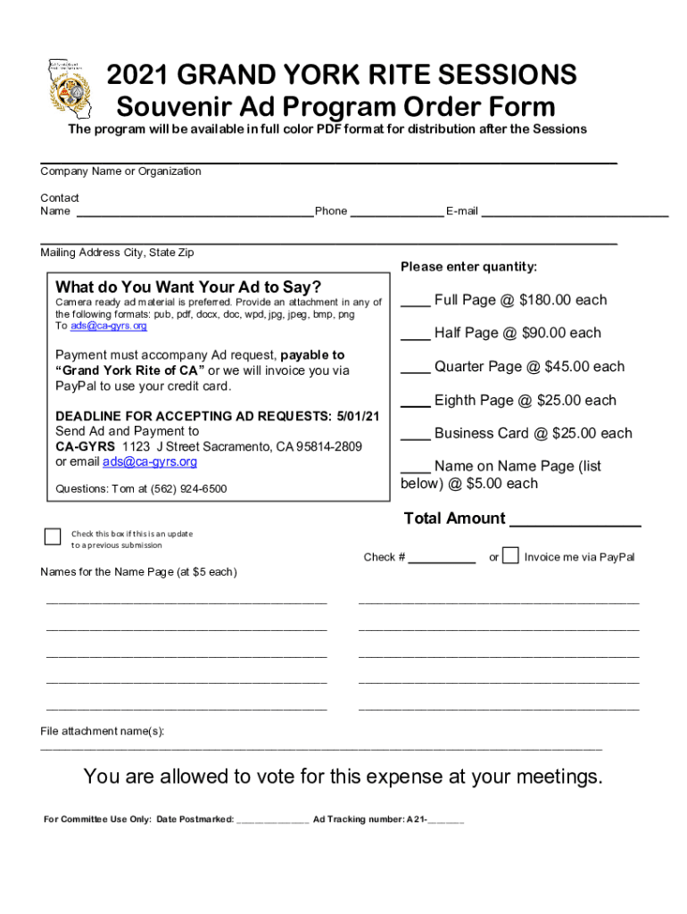 2021 GRAND YORK RITE SESSIONS Souvenir Ad Program Order Forth program will be available in full color PDF format for distribution after the Sessions Company Name or OrganizationContact Name Phone