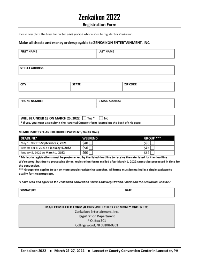 Zenkaikon 2022 Registration Formulas complete the form below for each person who wishes to register for Zenkaikon. Make all checks and money orders payable to ZENKAIKON ENTERTAINMENT, INC. FIRST NAMELESS