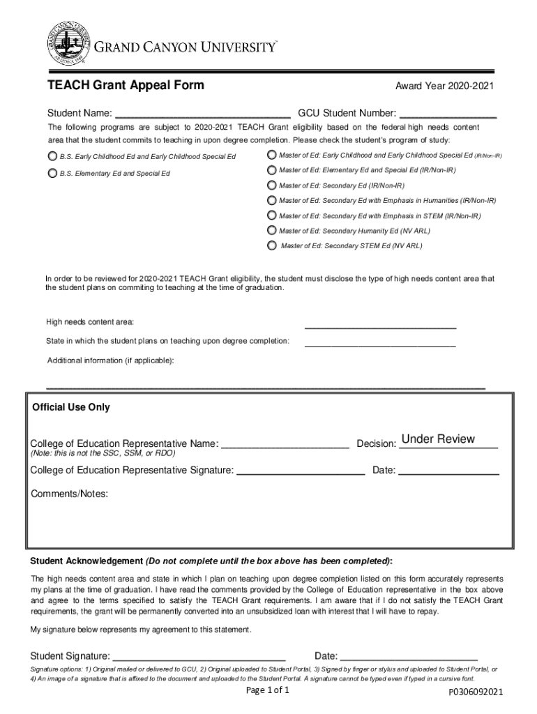 TEACH Grant Appeal Forward Year 20202021Student Name: GCU Student Number: The following programs are subject to 20202021 TEACH Grant eligibility based on the federal high needs content area that the