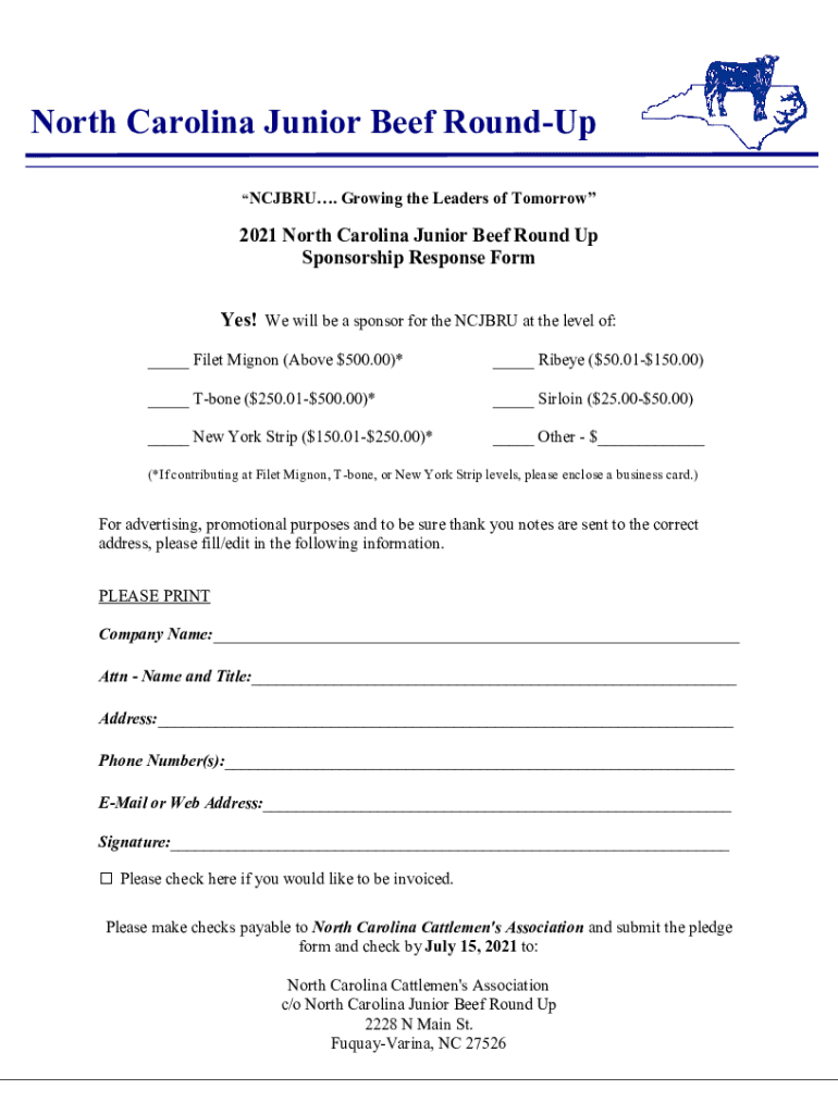North Carolina Junior Beef Roundup NCR. Growing the Leaders of Tomorrow2021 North Carolina Junior Beef Round Up Sponsorship Response Form Yes! We will be a sponsor for the NCR at the level of: Filet