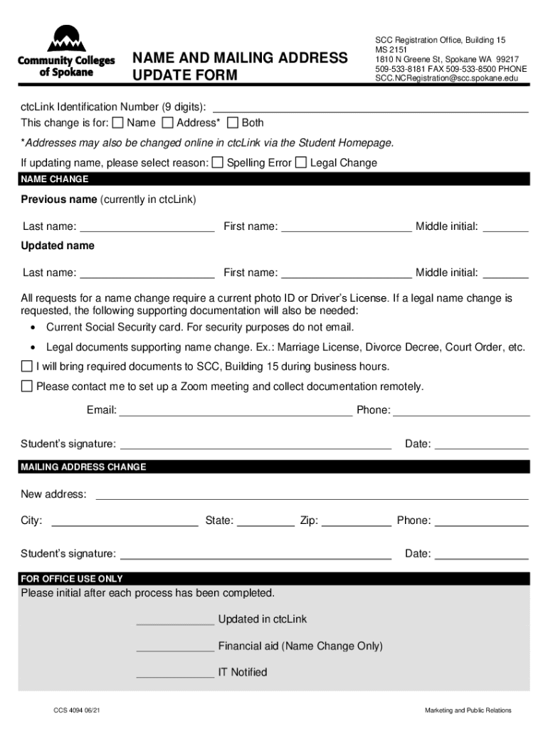 NAME AND MAILING ADDRESS UPDATE FORM cycling Identification Number (9 digits): This change is for: Name Address×SCC Registration Office, Building 15 MS 2151 1810 N Greene St, Spokane WA 99217 5095338181