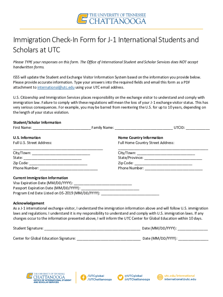 Immigration Checking Form for J1 International Students and Scholars at UTC Please TYPE your responses on this form. The Office of International Student and Scholar Services does NOT accept handwritten
