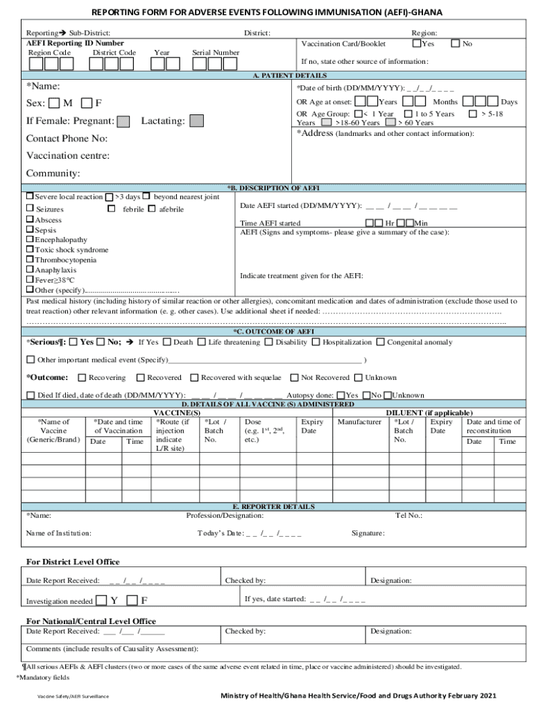 REPORTING FORM FOR ADVERSE EVENTS FOLLOWING Immunization (AEF)GHANA Reporting District: AEF Reporting ID Number Region Code District Redistrict:Region: Vaccination Card/Booklet YearNoSerial Number
