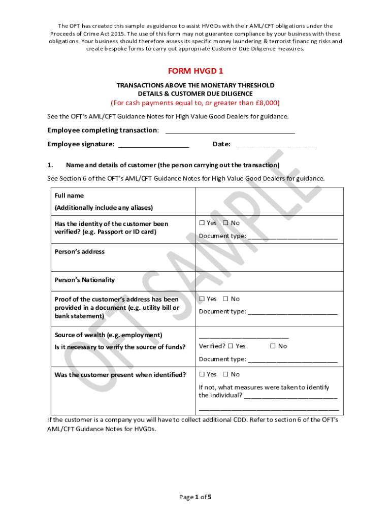 The OFT has created this sample as guidance to assist Hands with their AML/CFT obligations under the Proceeds of Crime Act 2015. The use of this form may not guarantee compliance by your business