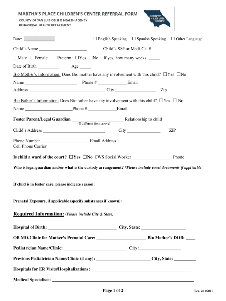 MARTHA PLACE CHILDREN CENTER REFERRAL FORM COUNTY OF SAN LUIS OBISPO HEALTH AGENCY BEHAVIORAL HEALTH DEPARTMENT English SpeakingDate:Child's Name Male Female Spanish-speaking Other LanguageChilds