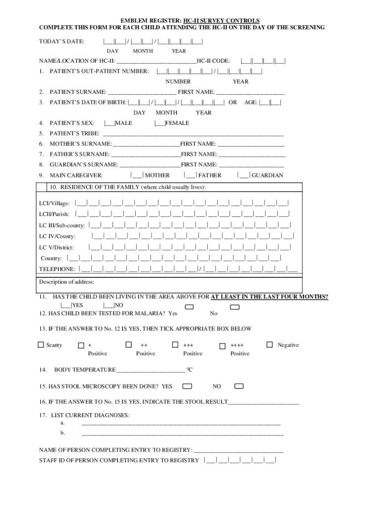 EMBLEM REGISTER: CII SURVEY CONTROLS COMPLETE THIS FORM FOR EACH CHILD ATTENDING THE CII ON THE DAY OF THE SCREENING TODAYS DATE: / / DAYMONTHYEARNAME/LOCATION OF CII: CII CODE: 1.PATIENTS OUTPATIENT