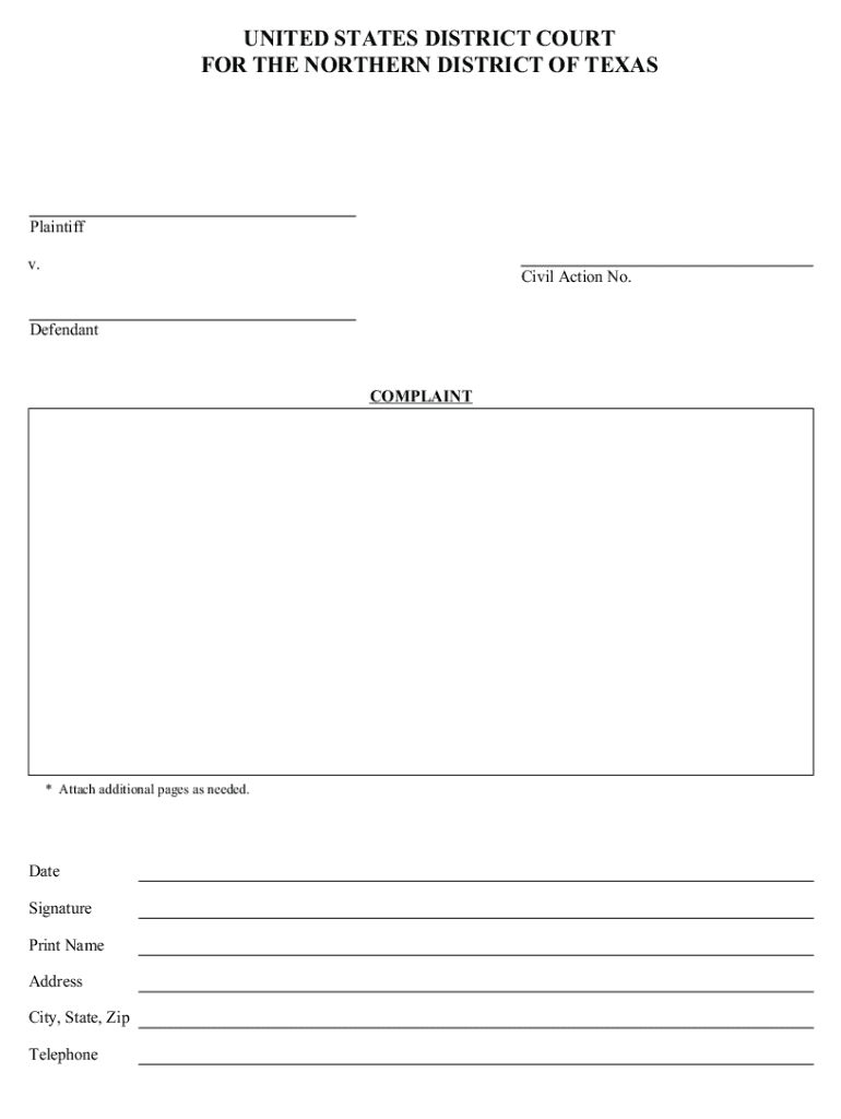 UNITED STATES DISTRICT COURT FOR THE NORTHERN DISTRICT OF TEXASPlaintiff v. Civil Action No. DefendantCOMPLAINT* Attach additional pages as needed. Date Signature Print Name Address City, State, Zip
