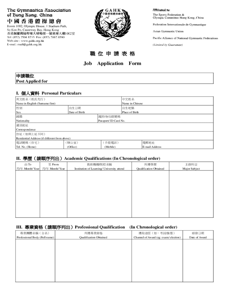Job Application Form Post Applied for I. Personal Particulars Name in English (Surname first) Name in Chinese Sex Date of Birth Nationality Place of Birth / Passport/ ID Card No. Correspondence Residential