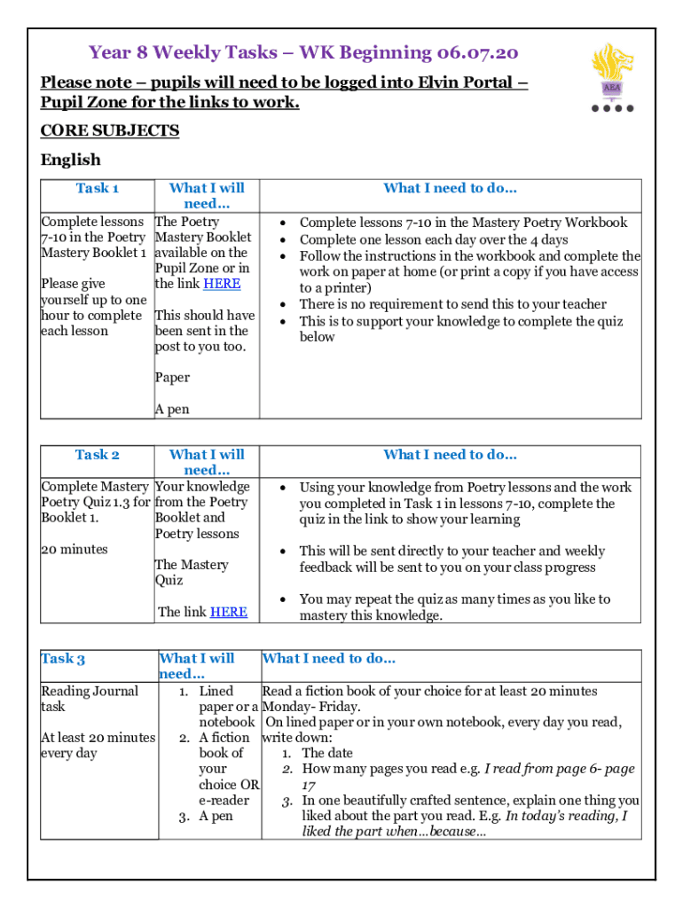 Year 8 Weekly Tasks WK Beginning 06.07.20 Please note pupils will need to be logged into Elvin Portal Pupil Zone for the links to work. CORE SUBJECTS English Task 1What I will need Complete lessons