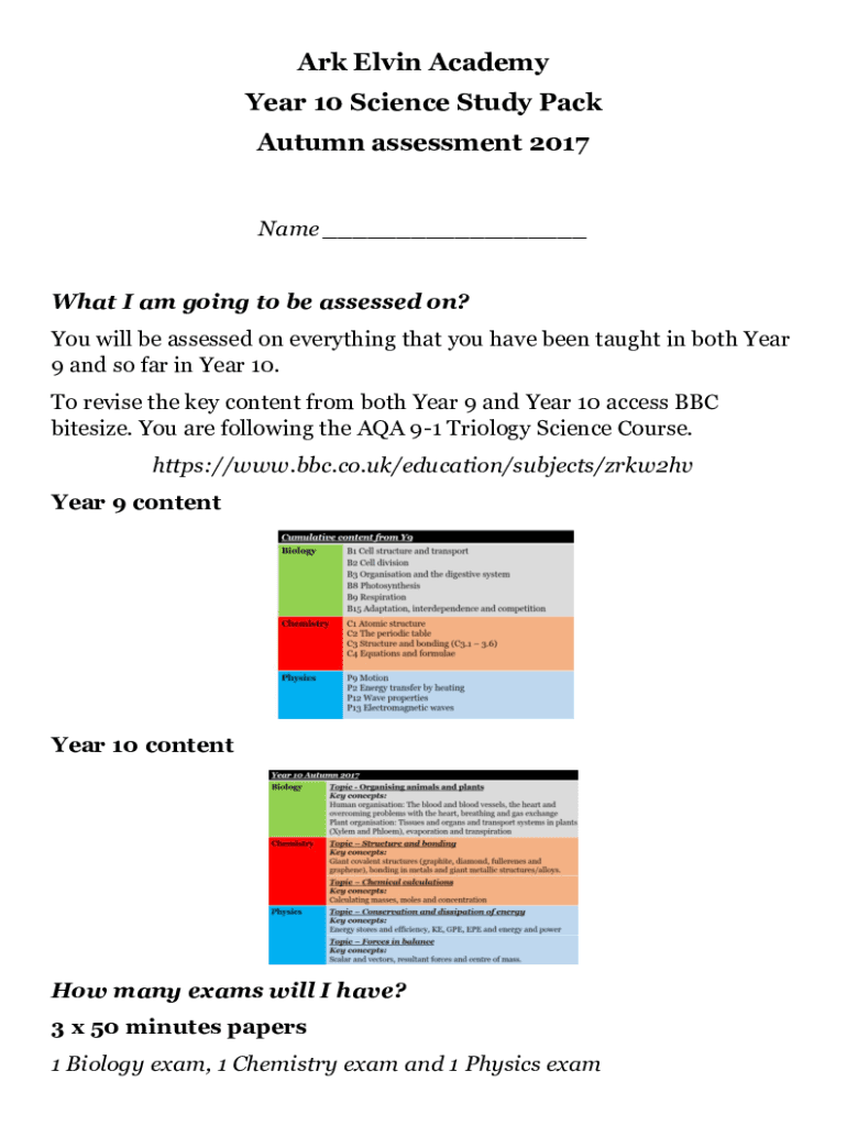 Ark Elvin Academy Year 10 Science Study Pack Autumn assessment 2017 Name What I am going to be assessed on? You will be assessed on everything that you have been taught in both Year 9 and so far in