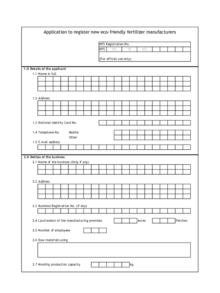 Application to register new eco-friendly fertilizer manufacturers NFS Registration No. NFS DIS DS ASC(For official use only) 1.0 Details of the applicant 1.1 Name in full1.2 Address1.3 National Identity