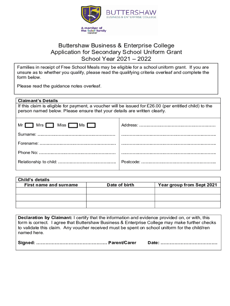 Butters haw Business & Enterprise College Application for Secondary School Uniform Grant School Year 2021 2022 UUU Families in receipt of Free School Meals may be eligible for a school uniform grant.