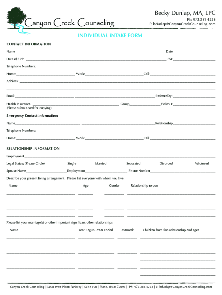 Becky Dunlap, MA, LPC pH: 972.381.4228 E: Dunlap CanyonCreekCounseling. Individual INTAKE FORM CONTACT INFORMATION Name Date of Birth SS# Telephone Numbers: Home: Work: Cell: Address: Email: Referred