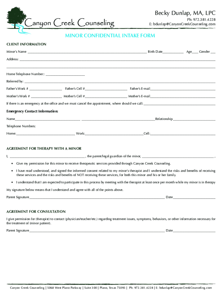 Becky Dunlap, MA, LPC pH: 972.381.4228 E: Dunlap CanyonCreekCounseling. Commoner CONFIDENTIAL INTAKE FORM CLIENT INFORMATION Minors Name Birth Date Age Gender Address: Home Telephone Number:: Referred