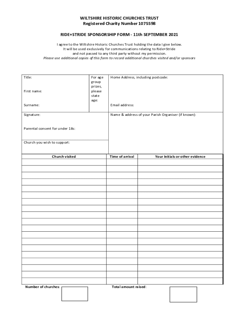 WILTSHIRE HISTORIC CHURCHES TRUST Registered Charity Number 1075598 RIDE+STRIDE SPONSORSHIP FORM 11th SEPTEMBER 2021 I agree to the Wiltshire Historic Churches Trust holding the data I give below.