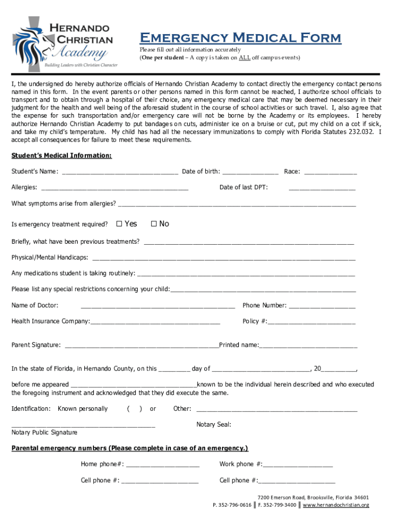Emergency Medical Form Please fill out all information accurately (One per student A copy is taken on ALL off campus events)I, the undersigned do hereby authorize officials of Hernando Christian Academy