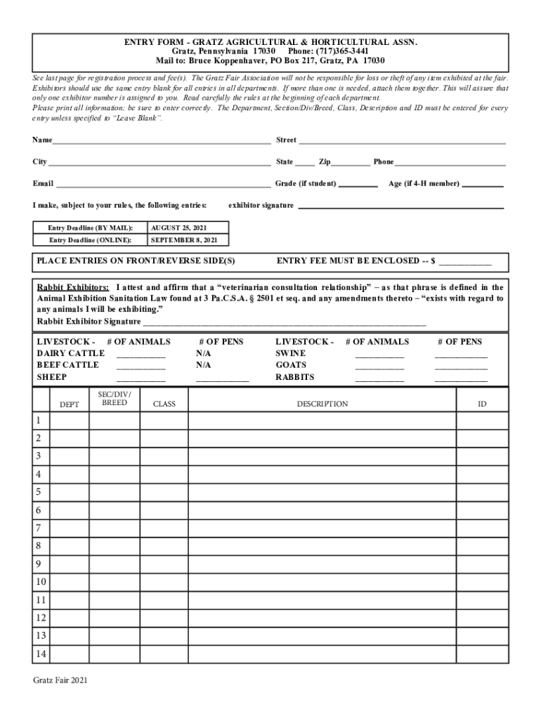 ENTRY FORM GRATE AGRICULTURAL & HORTICULTURAL ASSN. Grate, Pennsylvania 17030 Phone: (717)3653441 Mail to: Bruce Koppenhaver, PO Box 217, Grate, PA 17030 See last page for registration process and