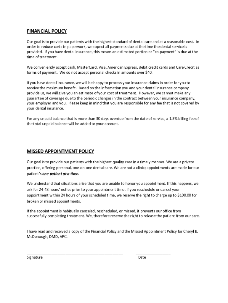 FINANCIAL POLICY Our goal is to provide our patients with the highest standard of dental care and at a reasonable cost. In order to reduce costs in paperwork, we expect all payments due at the time