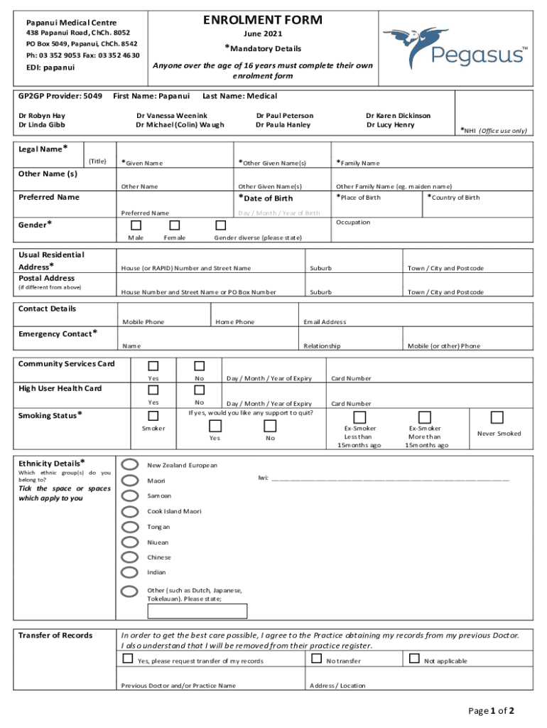 Enrollment FORMPapanui Medical Center 438 Japan Road, CCH. 8052June 2021PO Box 5049, Japan, CCH. 8542×Mandatory Details: 03 352 9053 Fax: 03 352 4630Anyone over the age of 16 years must complete