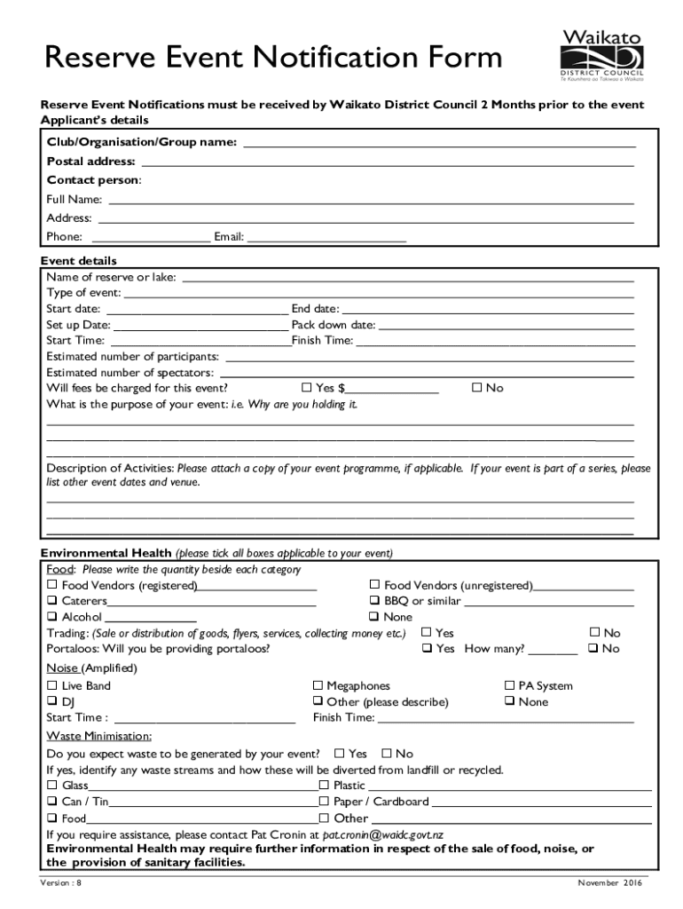 Reserve Event Notification Form Reserve Event Notifications must be received by Mankato District Council 2 Months prior to the event Applicants details Club/Organization/Group name: Postal address: