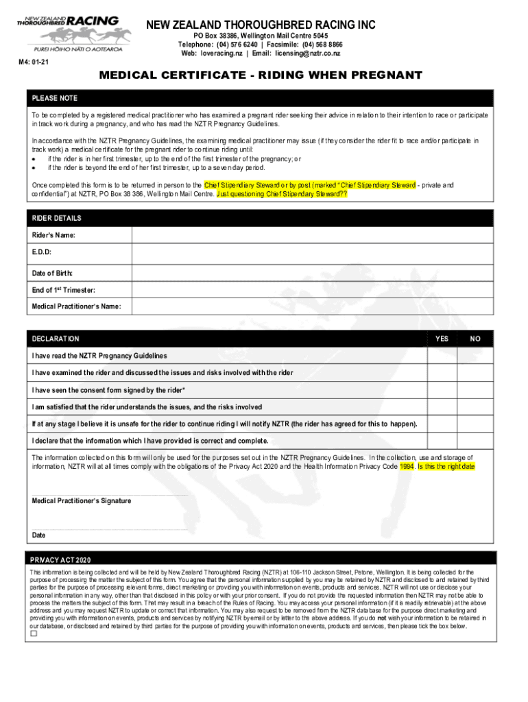 NEW ZEALAND THOROUGHBRED RACING INC PO Box 38386, Wellington Mail Center 5045 Telephone: (04) 576 6240 Facsimiles: (04) 568 8866 Web: love racing.NZ Email: licensing NTR.co.NZ M4: 0121MEDICAL CERTIFICATE