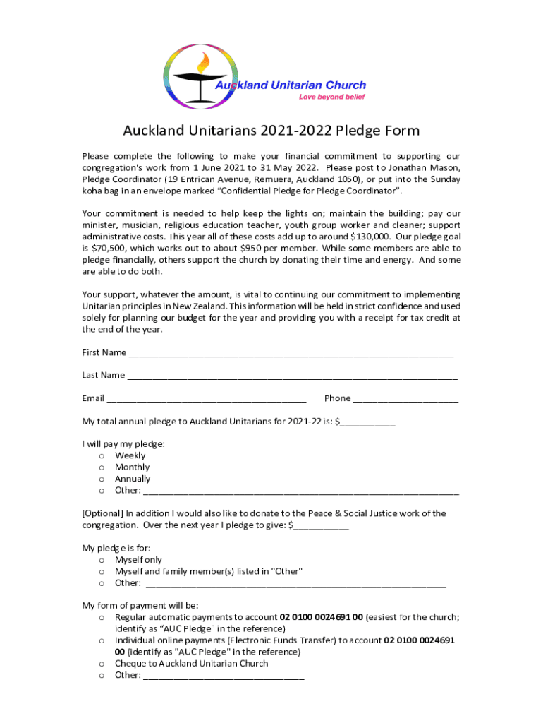 Auckland Unitarians 20212022 Pledge Form Please complete the following to make your financial commitment to supporting our congregation\'s work from 1 June 2021 to 31 May 2022. Please post to Jonathan