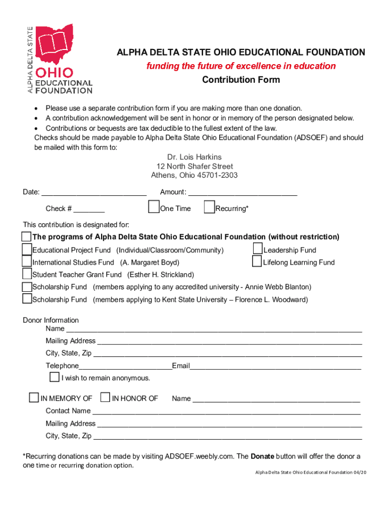 ALPHA DELTA STATE OHIO EDUCATIONAL FOUNDATION funding the future of excellence in education Contribution Form Please use a separate contribution form if you are making more than one donation. A contribution