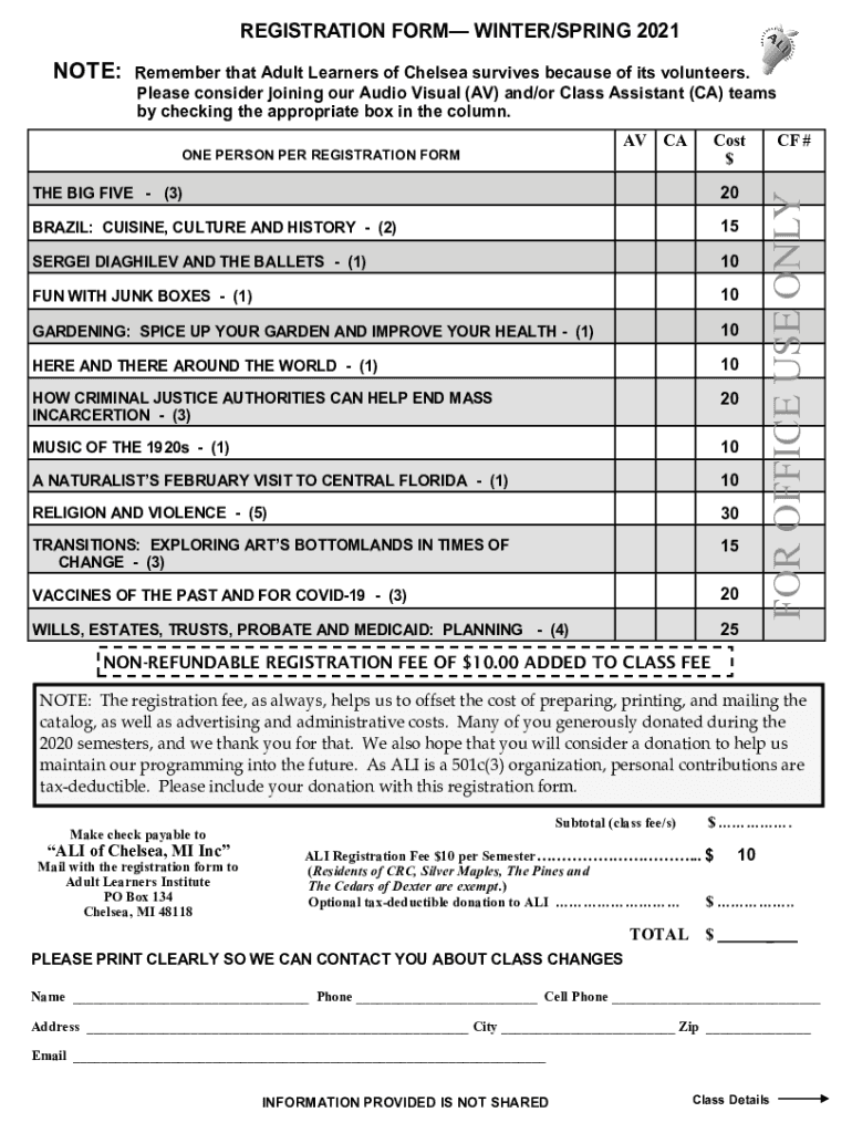 REGISTRATION FORM WINTER/SPRING 2021 Remember that Adult Learners of Chelsea survives because of its volunteers. Please consider joining our Audio Visual (AV) and/or Class Assistant (CA) teams by
